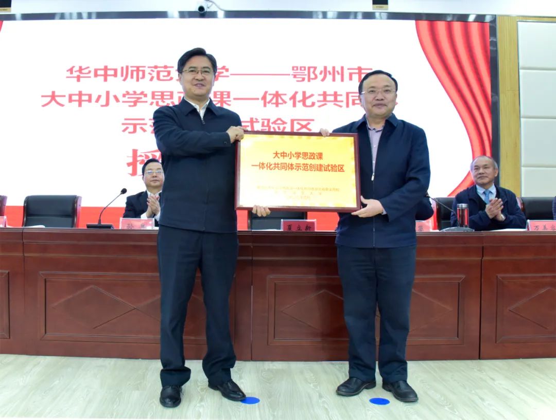 会上,夏立新向鄂州市授予“大中小学思政课一体化共同体示范创建试验区”牌匾,并为“鄂州市大中小学思想政治教育一体化建设推进中心”揭牌。与会领导共同向鄂州市15家单位授予“鄂州市‘大思政课’实践教学基地”牌匾。