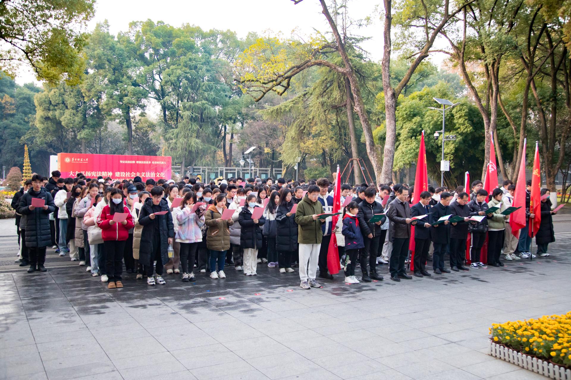 华大在线讯(通讯员 杨盼盼 肖扬)12月4日,米兰在线在文华公书林举行“国家宪法日”升旗仪式暨“宪法晨读”活动,副校长任友洲出席并致辞,相关职能部门负责人和二级学院师生代表参加活动。