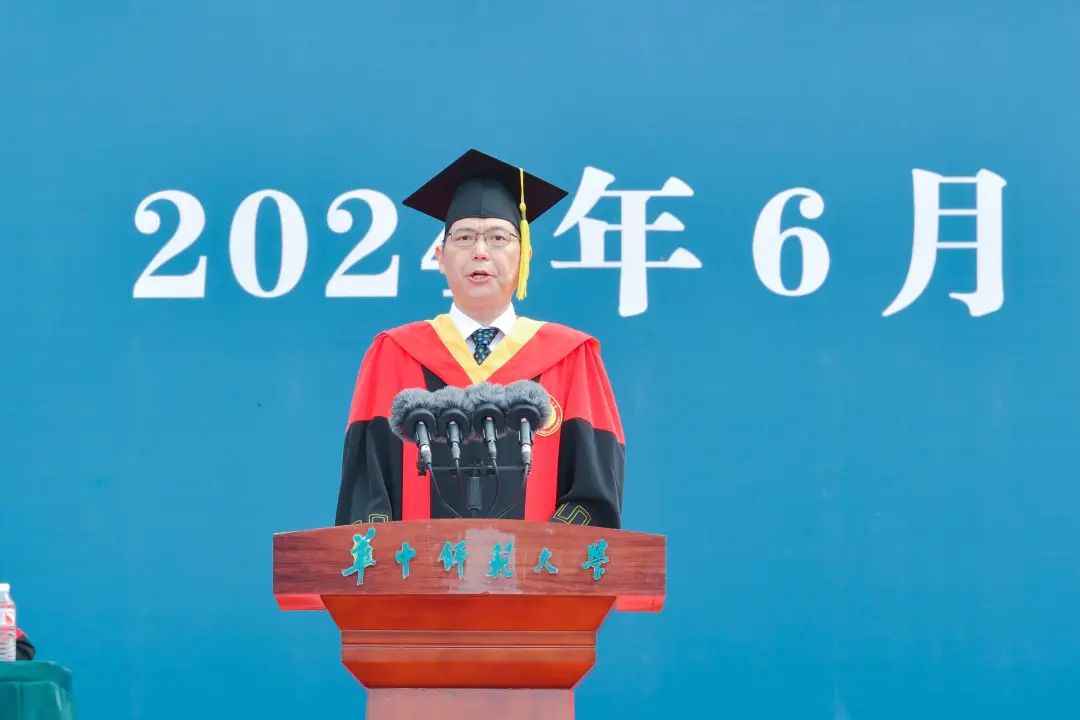 谈及同学们即将开启的人生新旅程,彭双阶希望同学们在不确定性中把握确定性,勇做担当民族复兴大任的时代筑梦人。他送给同学们四个“锦囊”:一是以理想信念的确定性应对人生际遇的“得”与“失”,树立远大的强国志向;二是以奋斗目标的确定性应对工作方式的“冷”与“热”,保持久久为功的韧劲;三是以精神追求的确定性应对生活情感的“苦”与“乐”,敢为人先、追求卓越;四是以教育情怀的确定性应对文化传承的“守”与“变”,弘扬教育家精神,踔厉奋发、笃行不怠。“青春不以山海为远,志愿只向家国未来”,彭双阶勉励全体毕业生不惧怕任何前进道路上的艰难困苦与风险变化,乘风破浪、奋勇前行。