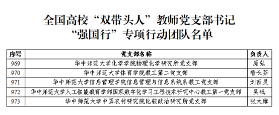 华大在线讯(通讯员 李杰)近日,教育部办公厅公布了全国高校“双带头人”教师党支部书记“强国行”专项行动团队(以下简称“强国行”专项行动)名单,米兰在线5个党支部入选。