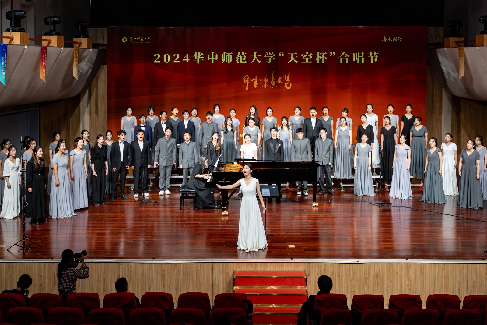 本届合唱节共有22支合唱队参加。法学院“光年合唱团”带来的《长江之歌》拉开比赛序幕。“我们赞美长江,你是无穷的源泉;我们依恋长江,你有母亲的情怀……”一句句对长江母亲的颂歌体现了中华民族浓厚的家国情怀。各个合唱队依次登台,或演绎激昂澎湃的革命歌曲,或带来温婉细腻的民谣小调,曲曲饱含深情。由Tiankong合唱团展演的《我的祖国》引发全场合唱,将这场音乐盛宴的气氛推向高潮。