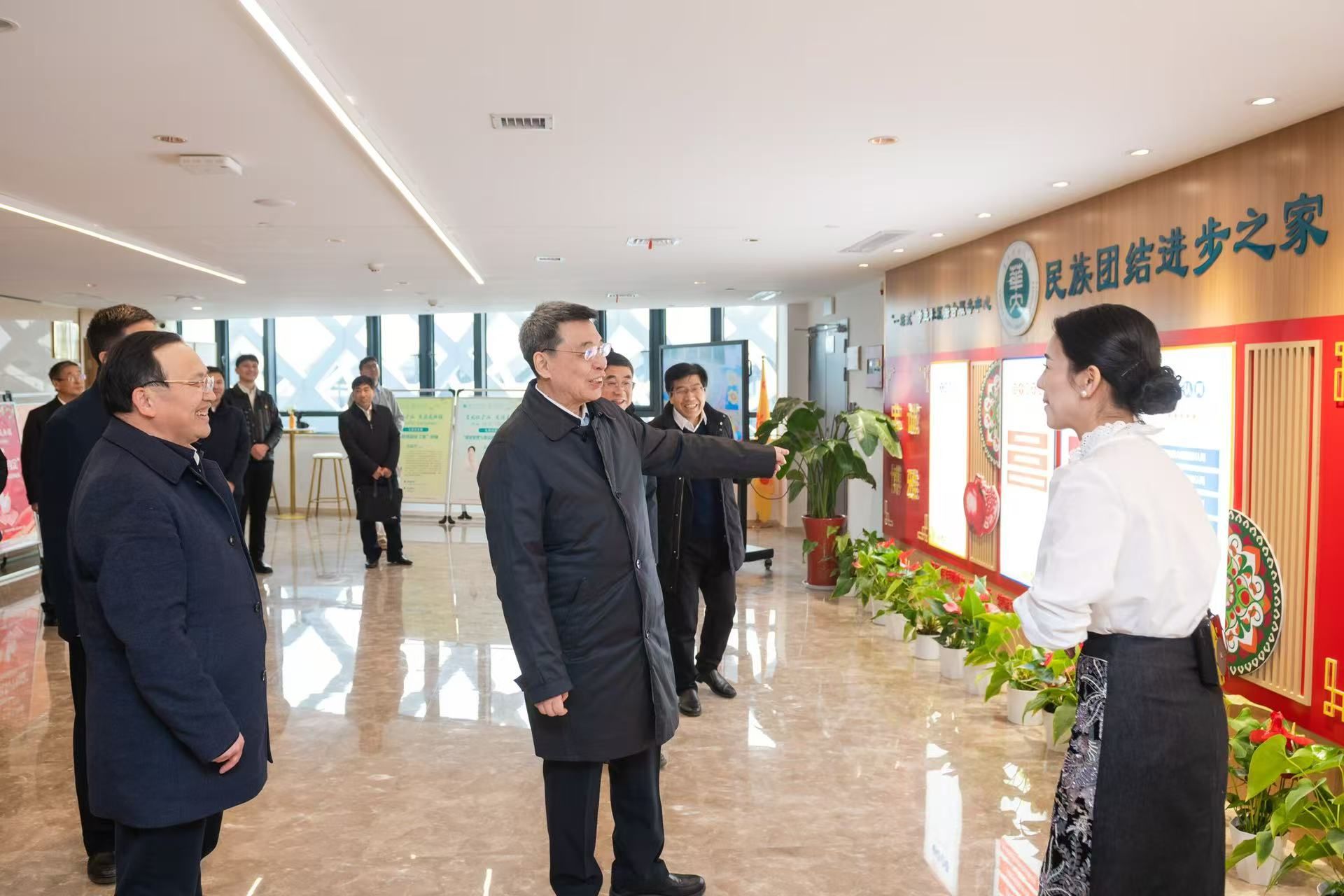 华大在线讯(记者 华轩)2月13日,中央统战部副部长,国家民委党组书记、主任潘岳来校调研,参观校史馆、美美与共民族团结工作室,听取米兰在线民族团结进步教育工作以及米兰在线湖北省铸牢中华民族共同体意识基地建设情况汇报。湖北省委统战部副部长、省民宗委党组书记、主任沙玉山,武汉市委统战部副部长,市民宗委党组书记、主任朱绍华,校党委书记夏立新,校长彭双阶,校党委副书记查道林、陈迪明等陪同调研。