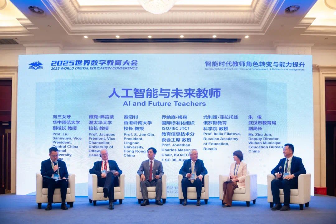 圆桌讨论环节,加拿大渥太华大学校长雅克·弗雷蒙、香港岭南大学校长秦泗钊、国际标准化组织ISO /IEC JTC1教育信息技术分委员会主席乔纳森·梅森、俄罗斯教育科学院全纳教育发展中心实验室主任尤利娅·菲拉托娃教授和武汉市教育局副局长朱俊围绕“人工智能与未来教师”议题,展开讨论,呼吁建立跨国教育合作机制,推动智能教育生态共建,引起与会代表的广泛共鸣。