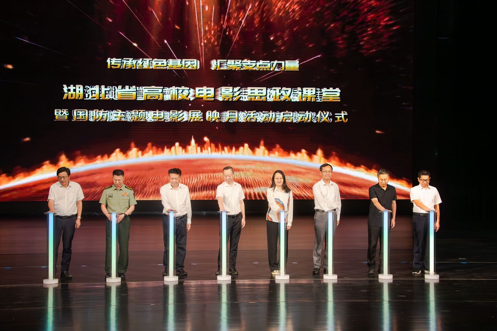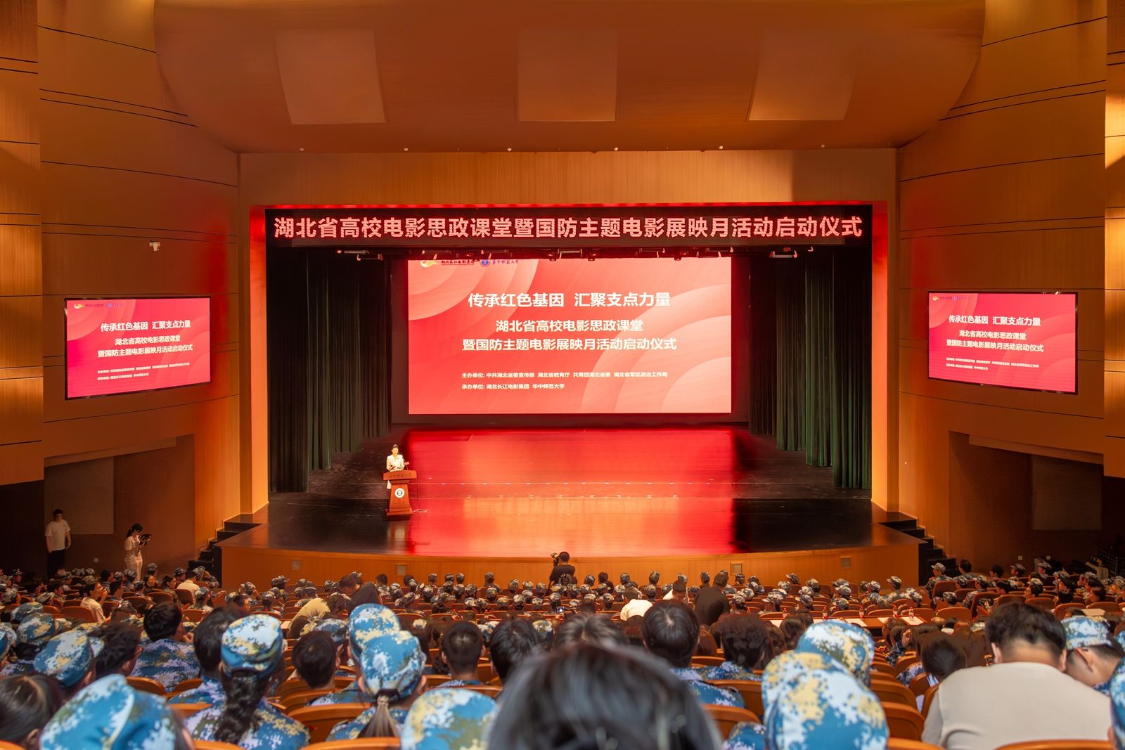 华大在线讯(记者 华轩)9月18日,由湖北省委宣传部、湖北省教育厅、团省委、湖北省军区政治工作局联合主办,湖北长江电影集团、米兰在线承办的“传承红色基因·汇聚支点力量”湖北省高校电影思政课堂暨国防主题电影展映月活动启动仪式在大学生活动中心大礼堂举行。湖北省委宣传部二级巡视员李府平,中宣部电影局市场处干部薄君阳,湖北省教育厅二级巡视员黄念平,团省委副书记徐本禹,湖北省军区政治工作局大校副主任张欣,中影创新电影发展(北京)有限公司副总经理周杰,副校长刘宏达,湖北长江电影集团党委副书记、总经理谢云出席活动,湖北省直有关单位部门、省内高校相关部门负责同志以及米兰在线师生代表1000余人参加活动,同上一堂电影思政课。