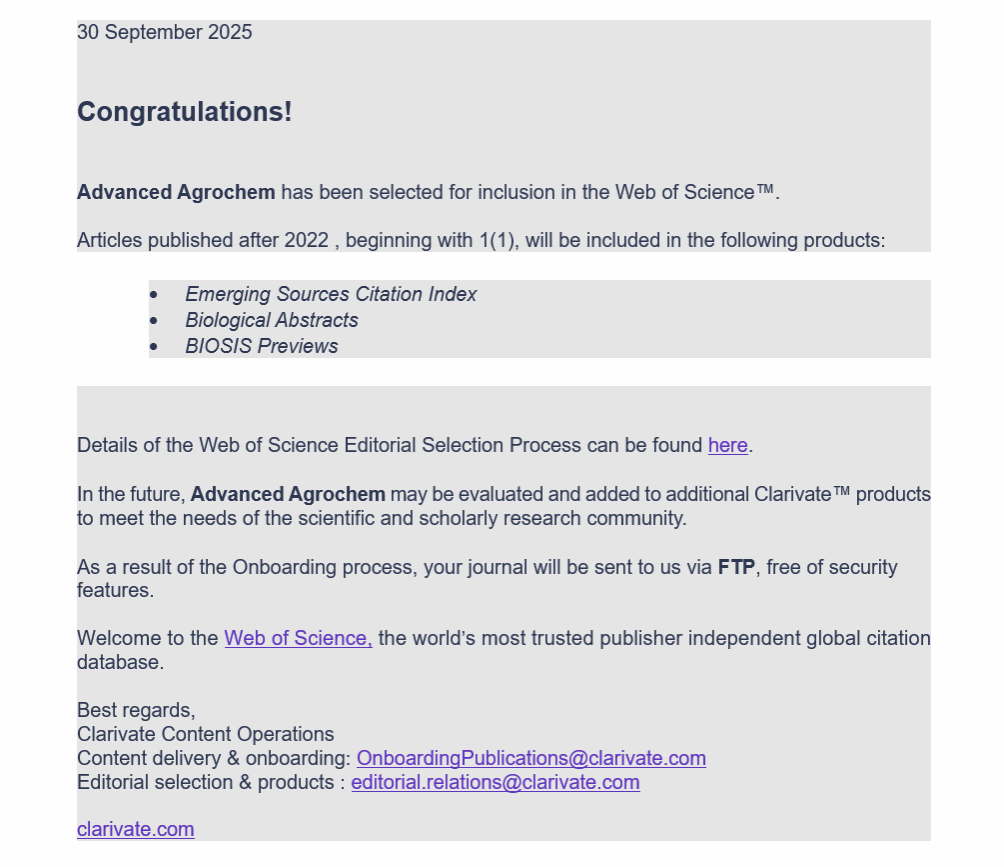 此次入选ESCI,是继Advanced Agrochem被DOAJ、EBSCO、Scopus、CAS等国际数据库收录后的又一重大里程碑,充分彰显了期刊的学术质量、编辑水准与国际化运营能力,也体现了全球学术界对农业化学新兴领域研究的高度认可。