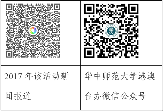 3.该活动往年有关报道可扫描下方二维码了解,也可参阅“米兰在线港澳台办”微信公众号或港澳台办网站hmt.ccnu.edu.cn。关于2018年活动详情可咨询国际处(港澳台办)汪亭亭老师、校团委陶力老师。