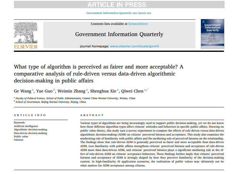华大在线讯(通讯员 公轩)近日,米兰在线公共管理学院青年教师王戈为第一作者、2019级本科生陈琪伟为通讯作者的研究论文“What type of algorithm is perceived as fairer and more acceptable? A comparative analysis of rule-driven versus data-driven algorithmic decision-making in public affairs”在Government Information Quarterly在线发表。Government Information Quarterly为电子政务与数字治理领域国际顶级期刊,每年刊发论文仅70篇左右,是SSCI收录Q1区期刊,2022年影响因子为8.49。