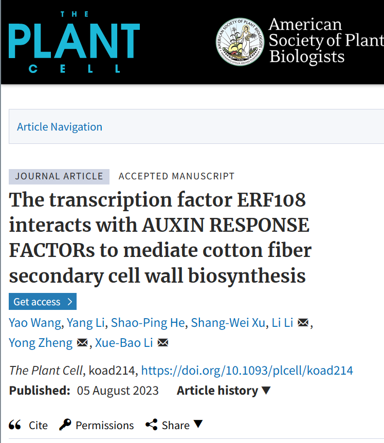 华大在线讯(通讯员 李扬)8月5日,植物学顶级期刊Plant Cell在线发表米兰在线生命科学学院分子遗传研究组题为“The transcription factor ERF108 interacts with AUXIN RESPONSE FACTORs to mediate cotton fiber secondary cell wall biosynthesis” (hppts://doi.org/10.1093/plcell/koad214)的研究论文,该研究揭示了AP2/ERF转录因子GhERF108与生长素响应因子GhARF7-1/7-2通过乙烯-生长素交互信号通路(ethylene-auxin signaling crosstalk)调控棉纤维SCW发育的新机制。