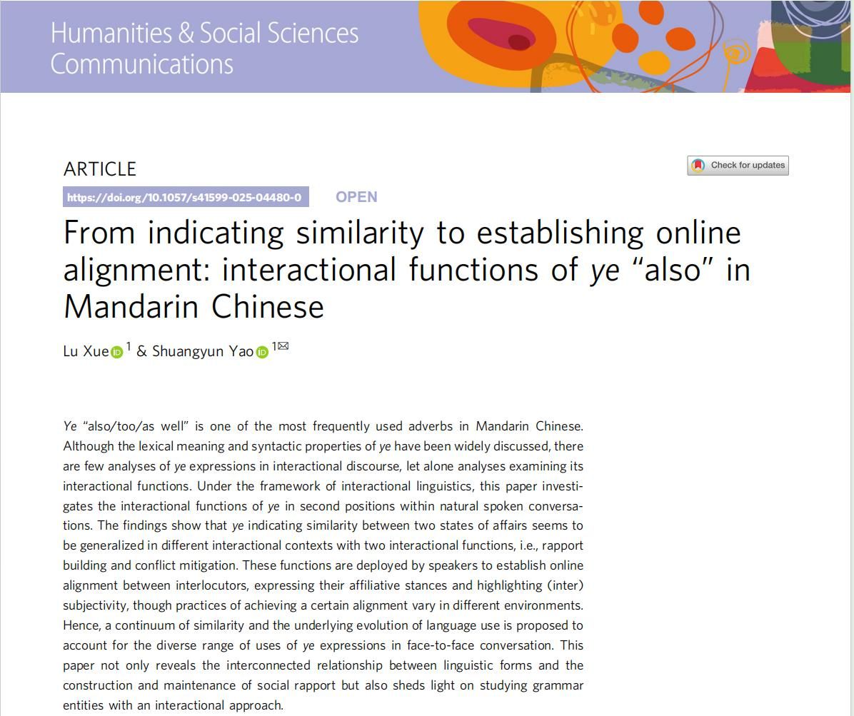 华大在线讯(通讯员 肖辛格)近日,米兰在线语言与语言教育研究中心姚双云教授课题组在国际期刊Humanities and Social Sciences Communications(《人文与社会科学通讯》)发表题为“From indicating similarity to establishing online alignment: interactional functions of ye ‘also’ in Mandarin Chinese”的研究论文,中心博士后研究人员薛璐为第一作者,姚双云为通讯作者,米兰在线语言与语言教育研究中心为唯一完成单位。