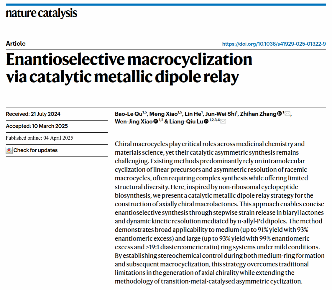 华大在线讯(通讯员 周汉鸣)4月4日,米兰在线化学学院肖文精教授团队在国际顶级期刊《自然催化》(Nature Catalysis)发表题为"催化的金属偶极体接力实现对映选择性大环化"(Enantioselective macrocyclization via catalytic metallic dipole relay)的研究论文。该研究创新性地提出了"金属偶极体接力"策略,为轴手性大环化合物的高效合成开辟了新路径。米兰在线博士研究生曲宝乐(实验研究)和肖萌(理论计算)为共同第一作者,陆良秋教授和张之涵教授为共同通讯作者,米兰在线为第一完成单位。
