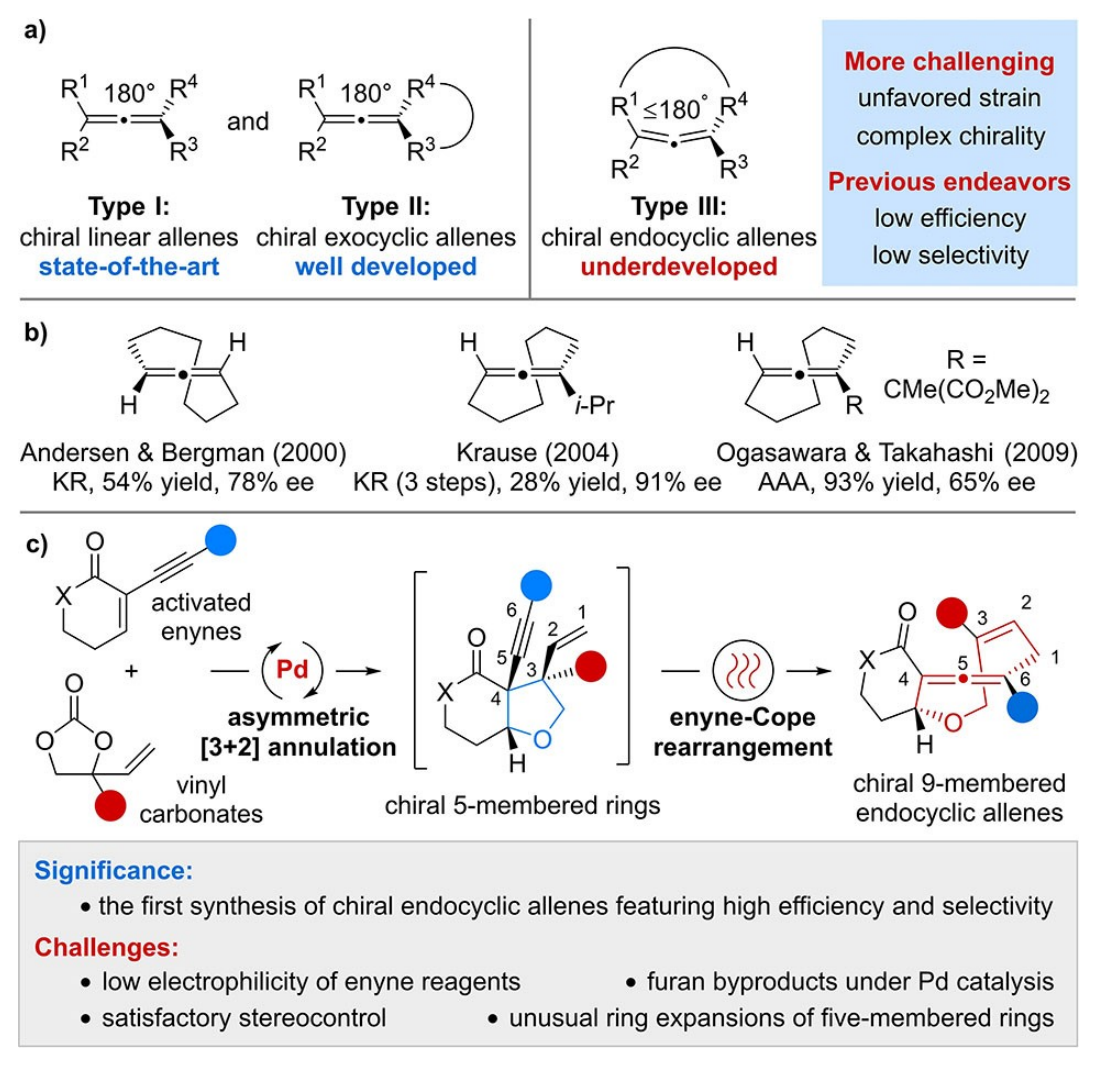 联烯化合物由于其独特的结构和性质,在合成化学、药物化学和材料科学等领域有着非常广泛的应用。因此,联烯合成一直是现代合成化学的一个重要研究内容。近年来,随着不对称金属催化和有机催化的快速发展,化学家们为手性联烯的不对称催化合成提供了许多有效的方法,但大多数集中于线性联烯或1,2-环外联烯的合成。手性1,3-环内联烯的不对称催化合成一直是该领域的一个重要挑战,尤其是具有中环结构的环内联烯由于其较大的环张力和复杂的手性环境(中心手性、联烯轴手性)更具挑战性,迫切需要发展新的策略用于这类中环骨架的高效、高选择性合成。